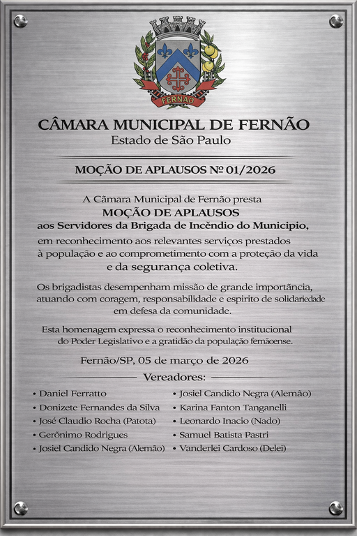 A Câmara Municipal de Fernão aprovou a Moção de Aplausos nº 01/2026, em reconhecimento aos servidores públicos municipais que integram a Brigada de Incêndio do município, destacando o trabalho e a dedicação desses profissionais na proteção da população